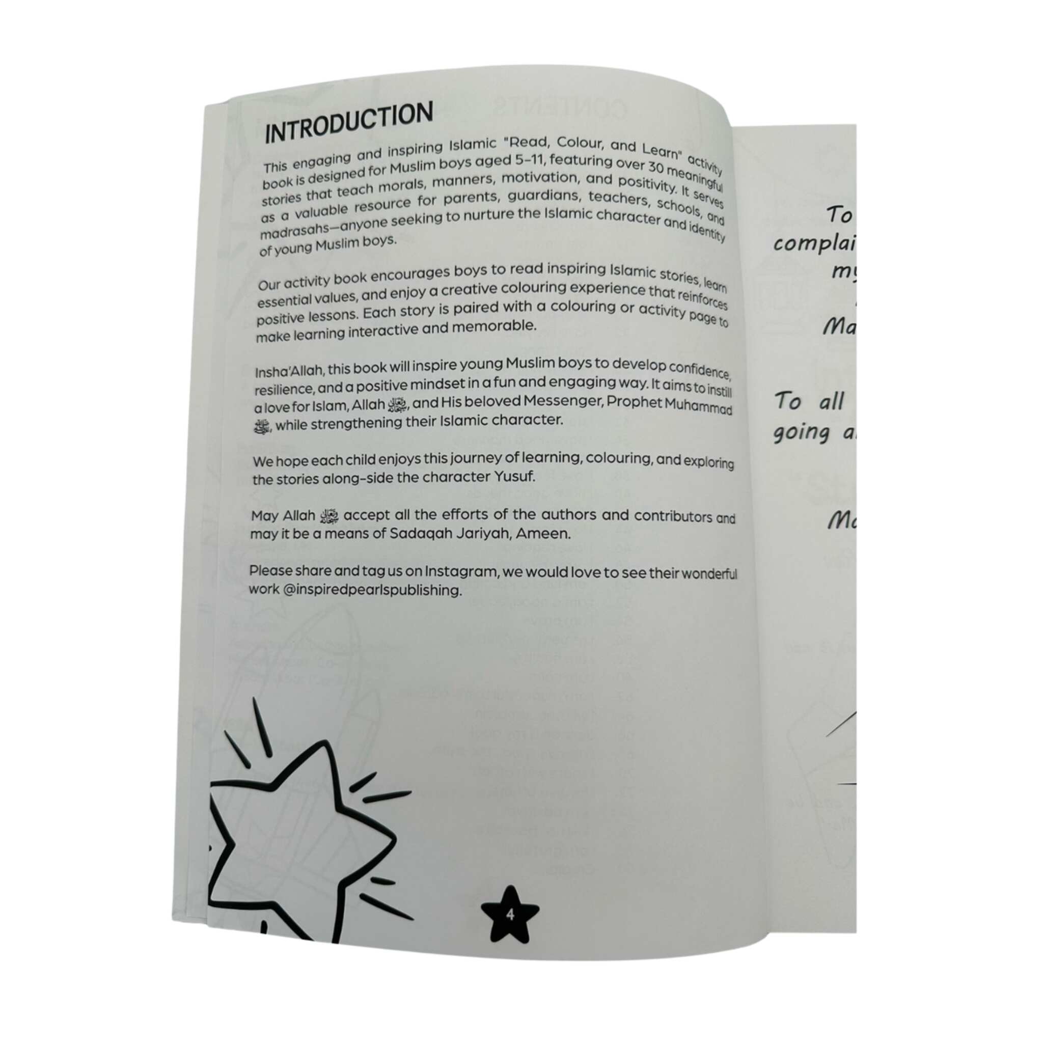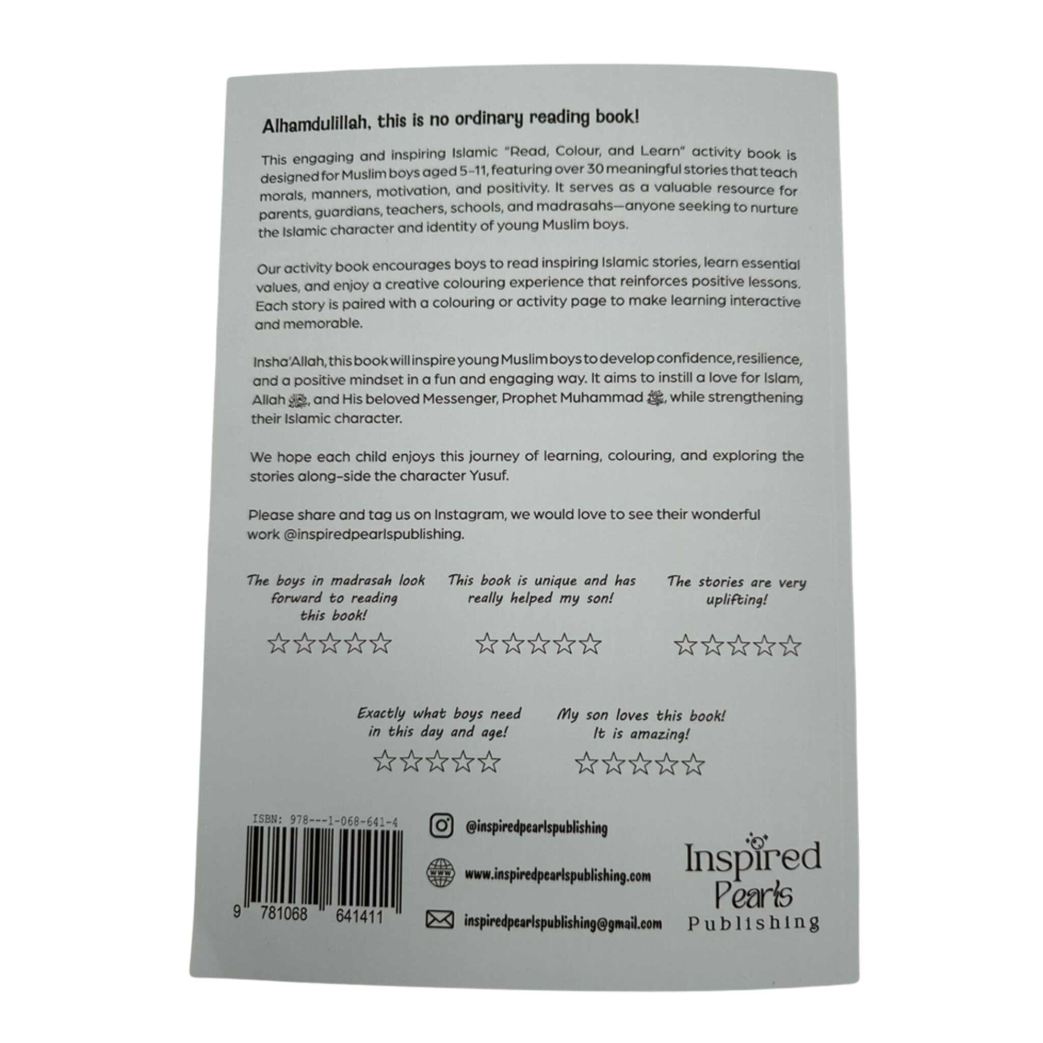 This engaging and inspiring Islamic 'Read, Colour and learn' activity book is designed for Muslim boys aged 5-11, featuring over 30 meaningful stories that teach morals, manners, motivation and positivity. It serves as valuable resource for parents, guardians, teachers, schools and madrasahs - anyone seeking to nurture the Islamic character and identify of young Muslim boys.